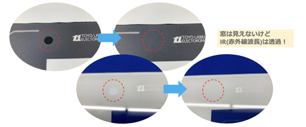 東洋レーベルでは、この課題を解決するために独自開発のIR透過インキと最適化された印刷構成を採用。これにより、IR窓を外観上ほとんど認識できないレベルでシームレス化することが可能になりました。