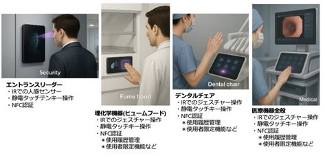 また、理化学機器(ヒュームフード)やデンタルチェア、医療機器では、IRによる非接触ジェスチャー操作や静電タッチキー操作に加え、NFCを用いた使用履歴管理や使用者制限機能を付与することで、安全性と利便性を両立した次世代のインターフェースが可能となります。